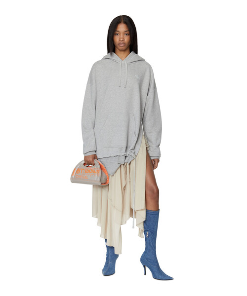 ルーズフィットのフーディパーカーにシフォンスカートをドッキングした異素材ミックスのディテールがディーゼルらしいワンピース。ボリューム感のあるスウェットに軽やかなシフォン素材のアシンメトリーなスカートを合わせたバランスが◎。足元をスニーカーからヒールに変えるだけで雰囲気も変わる、手軽にワンランク上のおしゃれが実現できるアイテムです。フード裾にはストッパー付きのドローストリング付きでシルエットの調節可能。
