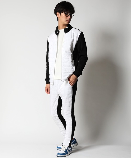 ■環境にも優しいトレンドの中綿素材のフェイクダウンを採用した、 スタンドブルゾン×スキニーパンツの上下セットアップ タウンユースはもちろん、ゴルフやスポーツ、アウトドアにも使え重宝します。 ■表が中綿のフェイクダウン素材、裏側が裏地にシャギーフリースを仕込んだスウェット素材の異彩を放つ上下セットアップ。 ■フェイクダウン×裏地シャギーフリースで非常に暖かいので冬に大活躍してくれます。 ■裏側がスウェット素材で動きやすく使いやすい。