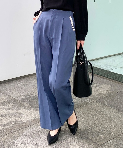 ポケット部分にフェイクパールをふんだんにあしらったデザインストレートパンツ。 【素材】 ダブルクロスという、程よい肉感がありながらしっかりときれいなシルエットを出してくれる素材を使用。 表面もとてもきれいな素材感なので、ONでもOFFでも着て頂ける素材感です。 ※オフホワイト(003)のみ膝丈裏地あり ※オフホワイト(003)はやや透け感があるため、インナーの着用をおすすめします。 ※マシンウォッシャブル機能つき 【デザイン】 スタイリングを華やかに仕上げてくれる、ポケット部分のフェイクパールがポイントのデザインパンツ。 裾にかけてすとんとおとした、ベーシックなストレートシルエットで、太すぎず細すぎず着用しやすく合わせやすいデザインに◎ インしたときにきれいにみえるよう、ウエスト周りのラインをすっきりとさせ、よりパールデザインを強調させ華やかさを演出。 ※ポケット数:横×2 後(ダミー)×2 こちらの商品は主に秋に着用いただける商品です。 モデル情報:身長168cm B76 W58 H86 着用サイズ:38(M) 店舗へのお問い合わせ商品番号:N02-65005 ●製品寸法: 36(S):W62~66cm H82cm 股下68cm 前股上32cm 渡り幅30cm 裾幅24cm 38(M):W64~68cm H84cm 股下69cm 前股上33cm 渡り幅31cm 裾幅25cm 備考: