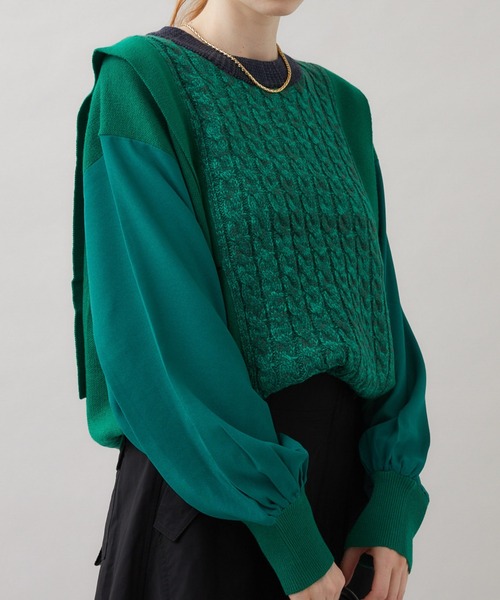柄編みニットとジョーゼット素材のドッキングプルオーバー。 ○POINT ・身頃のニット部分には配色と様々な編み柄が取り入れられた暖かみのある一着。 ・袖には柔らかなジョーゼット素材を使用し、袖口にギャザーを寄せた大き過ぎないボリュームスリーブが上品です。 ・大き過ぎないサイジングでボトムスのシルエットを選びません。 ○STYLING ・カラーを取り入れた配色のトップスは、ぜひデザインを活かしたシンプルなボトムスと合わせたコーディネートをお楽しみください。 裏地:なし 光沢:なし 伸縮性:あり 透け感:アイボリーのみあり 生地の厚さ:普通 ポケット:なし ※照明の都合上、多少の色ブレが生じてしまう可能性がございますので、予めご了承くださいますようお願いいたします。