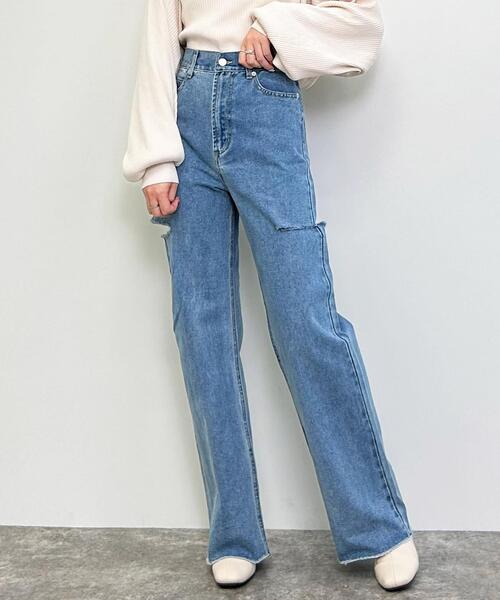 2022 秋アイテム カジュアルスタイルの定番デニムを大胆にカッティングしてスタイリッシュなデザインに。 裾も切りっぱなしのデザインでこなれた印象をプラス。 程よいゆとりのあるストレートシルエットで、ラフな着こなしを叶えます。 フロントとバックには便利なポケット付き。 合わせやすいベーシックなカラーのラインナップです。 ・ポケットあり 【以下デニム/ブルー参考。カラーにより多少の誤差あり】 ・透け感:透けない ・伸縮性:なし ・生地の厚さ:普通 ・裏地:なし