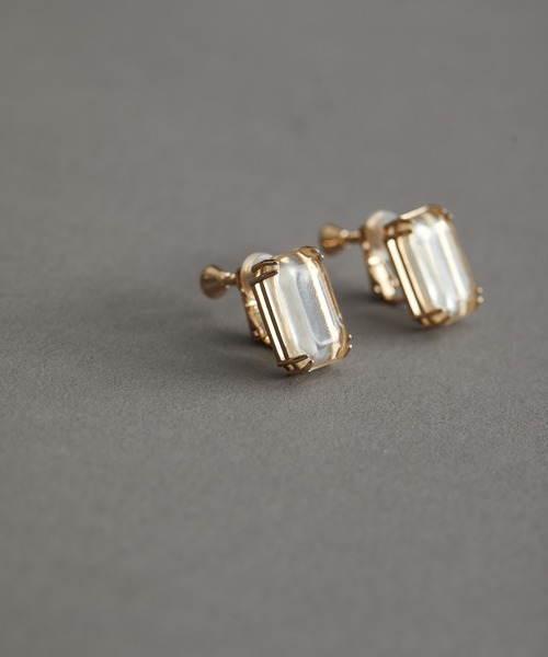 クリアに華奢なゴールドフレームが上品なビジューイヤリング【デザイン・シルエット】 オケージョンシーンにはもちろん、ふわっとした冬のお洋服に合わせる事で、きりっとクリアな印象でコーディネートのバランスを取ってくれます。 ねじバネ式のイヤリングで、耳裏部分にはシリコンキャップを付けているので挟み込んだ時のあたりを柔らかくしてくれます。 耳たぶの厚さによって取り外してご使用ください。 【カラー】 ゴールド×クリアの女性らしい組み合わせ。 正方形と長方形の2種類ございます。 ※画像の商品はサンプルです。 実際の商品と仕様、加工、サイズが若干異なる場合がございます。