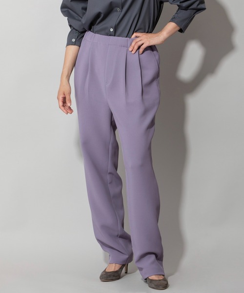 □2022 AUTUMN & WINTER COLLECTION□◆シーズンレスで使える程よいゆとりが抜け感のあるテーパードパンツ◆<MATERIAL>内側にコシの強いポリマー、外側にソフトな繊維を糸長差を持たせて配列しウール調のふくらみと合繊独特のソフトさドレープ性を表現したモランナという糸を使用しています。独特の軋み感を持ったドライタッチ、重すぎないふくらみが絶妙にマッチしたポリエステルの三重織素材です。ウール梳毛のようなさらっとしたクリアな表面感でストレッチ性も備えており快適な着心地です。また程よい肉感でオールシーズン使えます。仕立て映えに加えてシワになりにくい、お手入れの簡単なイージーケア素材でもあります。<DESIGN>リラックス感のあるややゆったり目のストレート寄りなテーパードシルエットです。総ゴムウエストでフロントには2タックを入れてゴムギャアーの分量をたたむことで、ゆったりサイズながらすっきりしたフロントにしています。程良いハリと落ち感を備えた素材なので身体のラインを拾わず、シルエットが保てます。フロントにギャザーがないためトップスをインしてもすっきりと着て頂けます。<COLOR>■ブラック:ベーシックなブラック。シンプルでどんなコーディネートにも馴染む万能カラーです。■パープル:グレイッシュなライトパープル。きれいめな雰囲気の差し色に。■キャメル:秋冬シーズンらしいニュアンスのシナモンカラー。ブラウン系の色味との相性も良く、オレンジ見えもするので差し色にもおすすめです。<SIZE>■普通体型157cmのスタッフはXSサイズを着用しています。■普通体型160cmのスタッフはSサイズを着用しています。■165cm以上でもやせ形の方はSサイズで問題なく穿けますが、骨盤がはっていたり、長めの丈感がお好みの方はMサイズをおすすめします。※ウエストは3cmずつ大きくなり、丈は2cmずつ長くなります。※光のあたり具合いやパソコンなどのモニター環境によって実際の色味と異なって見える場合がございますので、予めご了承ください。※着用商品はサンプルです。サイズ等の仕様に若干の変更がある場合がございますので、予めご了承ください。*お取扱いについては、商品についております品質表示、アテンションタグにてご確認ください。洗濯:洗濯機洗い可.............................≪INFORMATION ≫............................▼商品のお気に入り登録▼『♡』マークを押してお気に入り登録して頂いた商品は、セール開催の通知やクーポン発行などのキャンペーンなど、お得な情報をいち早く受けとる事が出来ますので、ぜひご登録ください。