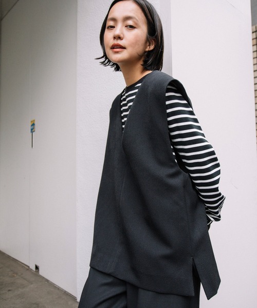 □2022 AUTUMN & WINTER COLLECTION□◆ゆったりとしたサイジングで深めのVネックが大人の女性らしい抜け感を演出するジレ◆<MATERIAL>梳毛のようなナチュラルなムラ感のある特殊なポリエステル糸を二重織にすることで、他にはない厚みとハリ感に仕上げた素材。上品できれいめに着られる大人の女性らしい雰囲気になっています。また、裏側の緯糸には赤外線を効率よく熱放射することができるウォーム素材のナノヒーティングを使用。軽い着心地と暖かさを兼ね備えた新素材です。<DESIGN>梳毛ライクでふくらみのあるナチュラルなニュアンスのポリエステル素材で作ったジレ。シャツ合わせやタートルネックのニット・カットソー、とろみのある素材のワンピースなどと合わせて着回しのできるアイテムです。アームホールもゆったりめに設定しているので袖のサイズにゆとりのあるアイテムにも重ねられます。コバステッチなどは一切入れず、つるりと上品な表情にしたのがこだわりです。着丈にも前後差を付けスリットを入れて動きのあるレイヤードスタイルに。裏地付きなので着心地も良いアイテムです。<COLOR>■ブラック:ベーシックなブラック。どんなスタイリングでも合わせやすく、細見えするカラーです。■グレイッシュベージュ:落ち着いたやさしい色味のグレージュ。女性らしく品よく着られるカラーです。■キャメル:赤みを抑えたキャメル。こなれた印象も演出できるおしゃれ見えするカラーです。※光のあたり具合いやパソコンなどのモニター環境によって実際の色味と異なって見える場合がございますので、予めご了承ください。※着用商品はサンプルです。サイズ等の仕様に若干の変更がある場合がございますので、予めご了承ください。*お取扱いについては、商品についております品質表示、アテンションタグにてご確認ください。洗濯:ドライクリーニング.............................≪INFORMATION ≫............................▼商品のお気に入り登録▼『♡』マークを押してお気に入り登録して頂いた商品は、セール開催の通知やクーポン発行などのキャンペーンなど、お得な情報をいち早く受けとる事が出来ますので、ぜひご登録ください。