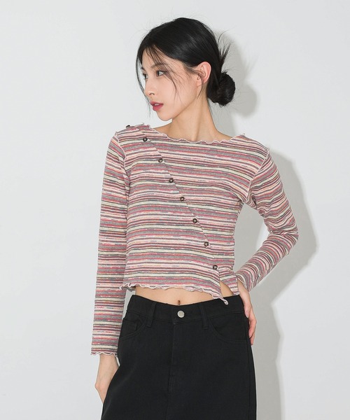 [POINT]-ユニークなムードのカラーミックスストライプパターンのクロップドTシャツ-斜めボタンディテールでポイントUP!-ネックライン、裾、袖波デザインでキッチュなムード-クロップド丈で長く見える脚のラインを演出![MATERIAL]裏地:なし/厚さ:普通/季節感:春秋冬/透け感:なし/伸縮性:良い※ご覧のモニター環境や撮影環境により実際の商品と多少色味が異なって見える場合がございます。※サイズの測定方法によって1~3cm程度の誤差が生じることがございます。※全ての商品の最初の洗濯はドライクリーニングをお勧めし、乾燥機のご使用はご遠慮ください。※洗濯不注意による商品の損傷の交換/払い戻しのご対応は難しくなっております。※濃いカラーの商品は素材の特性上、汗や水による色移りの可能性がございます。明るい色の下着やバッグ、その他のアイテムとの摩擦、色移りにご注意ください。-デニム※商品の特性上、単独洗濯をお勧めし、長時間水に浸けておくと色移りする恐れがありますので、ご参考ください。※生地の特性上、水洗いの際に収縮や変形の可能性がございますので、商品の洗濯はドライクリーニングをお勧めします。※白色等の明るい色の商品(靴、バッグ、椅子、シートなど)との併用はご遠慮ください。ご理解、ご参考の程よろしくお願いいたします。もっとお買い物を楽しむために!商品のお気に入り登録お気に入りの商品やサイズ・カラーまで、お気に入りの登録をしていただきますと、そのアイテムのセールの通知、ラスト1点になった時の通知や、完売しても再入荷通知を受け取ることができます!ブランドのお気に入り登録新商品の発売や再入荷、タイムセールやクーポン発行のお知らせなど、FOLLOWINがお届けするお得な情報を受け取ることができます!※通知はアプリでも受け取ることができますので、是非アプリの通知設定をお願い致します!※他のキャンペーンにより、期間中に価格が変動する場合があります。※セールは予告なく終了させていただく場合もあります。