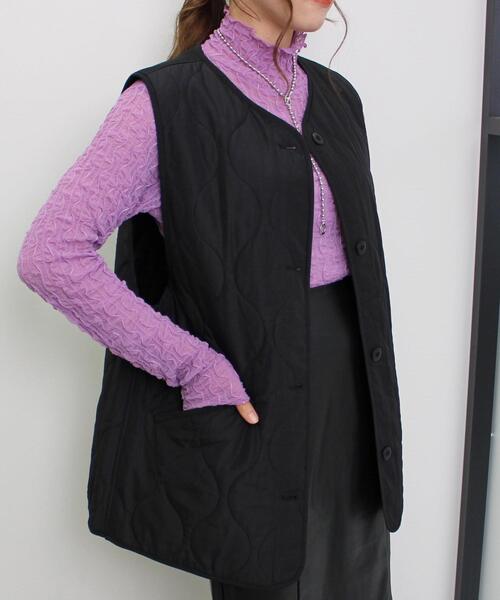 2023 SS 春アイテム 軽い着心地でロングシーズンで活躍するキルティングベスト。丸みを帯びたキルトのデザインが大人かわいさを演出。ゆったりとしたサイズ感でラフに着こなせ、コーデに抜け感をプラスしてくれます。中綿入りのふっくらとした絶妙な立体感で、保温性も抜群。アウターの下に重ねて防寒対策としても重宝します。フロントには便利なポケット付き。・ポケットあり【以下カーキ参考。カラーにより多少の誤差あり】・透け感:透けない・伸縮性:なし・生地の厚さ:普通・裏地:あり