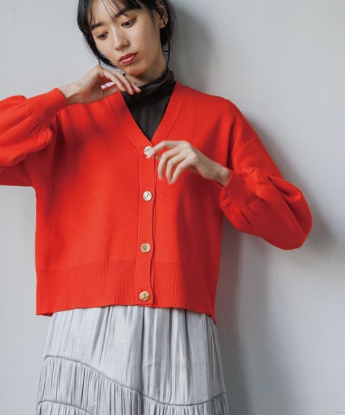 【STORY11月号掲載】ボリューム袖が今年らしい良質素材のカーディガン【デザイン】・袖にボリュームを出し、デザインポイントにしたVネックカーディガン。・ほどよくゆとりを残したボディで抜け感あるきこなしがおすすめ。ボタンを留めてトップスライクに着こなしても◎・袖のボリューム感とやや短めに設定した着丈がポイントで、シンプルになりすぎず女性らしい印象に。・袖を少しタックアップして、より袖のボリューム感をプラスして楽しむスタイルもおすすめです。【素材】・細番のウール混ストレート糸と光沢のあるヴィスコースを撚糸した上品な光沢と綺麗な目面が特徴のハイゲージニット。・ポリエステルを合わせて編み上げることで、編地に適度なふくらみと肉感をプラス。・秋、冬、春の3シーズン着用可能です。※ご家庭の洗濯機でのお洗濯が可能です。マシンウォッシャブル、イージーケア。※オフホワイト(003)はやや透け感があるため、インナーの着用をおすすめします。※中性洗剤でお洗濯をお願い致します。こちらの商品は主に冬に着用いただける商品です。モデル情報:身長165cm B72 W57 H84 着用サイズ:38(M)店舗へのお問い合わせ商品番号:637-35023●製品寸法:36(S):着丈51cm B100cm 袖丈49cm 肩幅46cm38(M):着丈53cm B104cm 袖丈50cm 肩幅48cm40(L):着丈55cm B108cm 袖丈51cm 肩幅50cm備考: