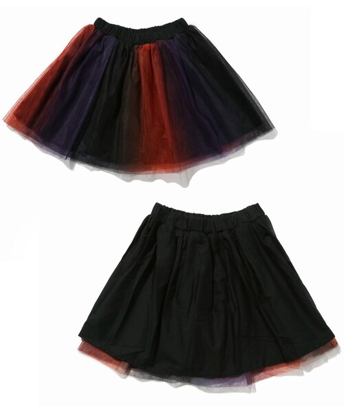 【デザイン】 繊細な印象のチュールスカート見えとカジュアルな綿素材のフレアスカート見えのリバーシブルで着用可能な2WAYスカートです。 ハロウィンコーデにもぴったりなオレンジ系のグラデーションプリントや、大き目のドット柄が目を引くアイテム! コーデの主役になっちゃいますね♪ ※ポケットなし 【生地感】 表地:ポリエステル100%のさらっとした生地感! 裏地:コットン100%の程よいしっかりさのある生地感! ※リバーシブル ※モデル画像と商品単品の画像はそれぞれ、照明や太陽光の関係により実際よりも色味が違って見える場合があります。(実際のお色味に近いのはスタジオで撮影した単品画像です) またパソコン・スマートフォンなどの環境により、若干製品と画像のカラーが異なる場合もございます。予めご了承ください。 店舗へのお問い合わせ商品番号:122-75044 ●製品寸法: 10(100cm):W42cm~54cm H72cm 総丈31cm 11(110cm):W45cm~57cm H78cm 総丈33cm 12(120cm):W48cm~60cm H83cm 総丈35cm 13(130cm):W50cm~62cm H88cm 総丈37cm 備考: