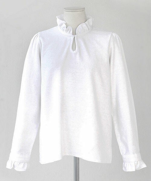 首元のフリルがポイントになったブラウス。ネックラインと袖の裾はフリルになっています。ネックライン中央はドロップ型のカットアウトがポイント。ホックで開閉が出来るようになっています。 一枚での着用はもちろん、レイヤードアイテムとしても活躍してくれる優秀な1枚。ホワイトとピンクの2色展開です。