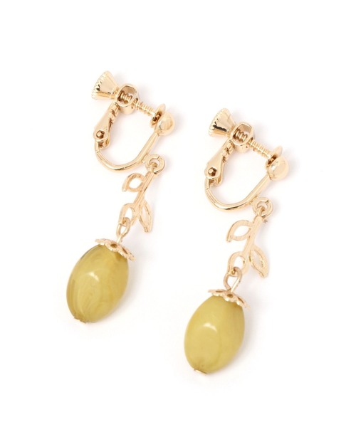 ーーー リーフ型のメタルパーツとビーズを組み合わせたイヤリング。 果物のような、木の実のようなかわいいデザイン。 合わせやすいやさしいカラーの展開。 お出掛けの際にサラッと付けるだけで様になるアイテムです。 ーーー