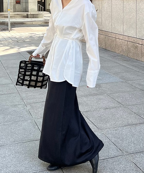 シンプルなIラインスカートです?タイトなシルエットですが、ウエスト部分はゴムで、生地も薄めでストレッチ性があるので歩きやすいアイテムです!ウエスト部分はストリングで調節が可能なので楽に履いていただけます!止まるとストンとした形ですが、動くと女性らしい柔らかい動きが出て色んな印象を楽しめます◎かたちが綺麗でスッキリした印象を与えてくれるので、レイヤードコーデなどにも使いやすいと思います!着用カラー:black