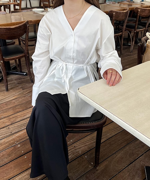 ウエストマークができる紐付きのシャツです?着回し力が抜群で、写真のような着方から紐なしの着方、タックインするなど、着方によって雰囲気がガラッと変わるアイテムです!首元はスッキリ開いたVネックで寒い季節にはハイネック合わせがおすすめです◎サイドのスリットがこなれ感を演出してくれ、おしりまで隠れる丈感が体型カバーも叶えてくれます!着用カラー:ivory