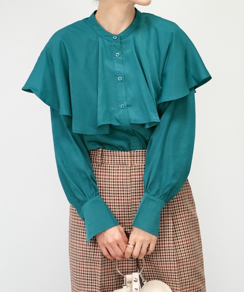 着映えシルエットのケープ風ヨークブラウス。さりげない光沢感が上品な風合いのブラウス。スタンドカラーなのでケープデザインが甘くなりすぎず、どんなスタイルにもマッチします。落ち感のある素材で、カジュアルからフォーマルまで幅広いシーンで活躍する万能アイテム◎。イン・アウト、どちらもサマになるデザインで着回し力抜群です。ベーシックカラーとシーズンムードのあるブルーの3色展開。カジュアルダウンするならデニムと合わせてブーツやローファーを履けばこなれ感のあるカジュアルな仕上がりになります。■商品仕様光沢のあるポリエステル生地裏地…なし伸縮性…なし透け…淡色のみありポケット…なし付属品…なし着脱…前開きボタン※ボタンの仕様は変更される場合がございます。※繊細な生地ですのでお洗濯などのお取り扱いには十分ご注意ください。詳しくは下げ札をご覧ください。※着用の際、摩擦や発汗により衣類やバッグ等に色移りの恐れ(特に淡色系のもの)がありますので、十分ご注意下さい。※淡色は透けますのでインナーの着用を推奨します。【ご購入前に必ずご一読下さい】※モニタ環境によって、商品の色合いが多少異なる場合がございます。※色落ちの恐れがありますので、他のものと分けてお洗濯して下さい。※商品をお安く提供させて頂く為、検品後のアイロン掛けは省略させて頂いています。発送時も簡易梱包の為、お受け取り時にたたみ皺があると思いますがご了承下さい。