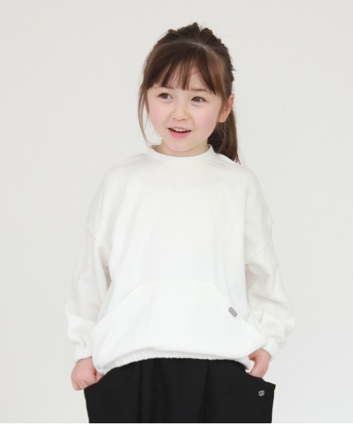 裏毛素材を使用した今季オススメのスウェットトップス。 脇までつながったカンガルーポケットが可愛いデザイン。 袖口と裾にゴムが入っているため、1サイズUPも問題なく着用可能。 ゆったりシルエットですが、ゴムが引き締めてくれるので"着られている感"が出にくく、小さなお子様もトレンド感が出るルックを作れます。