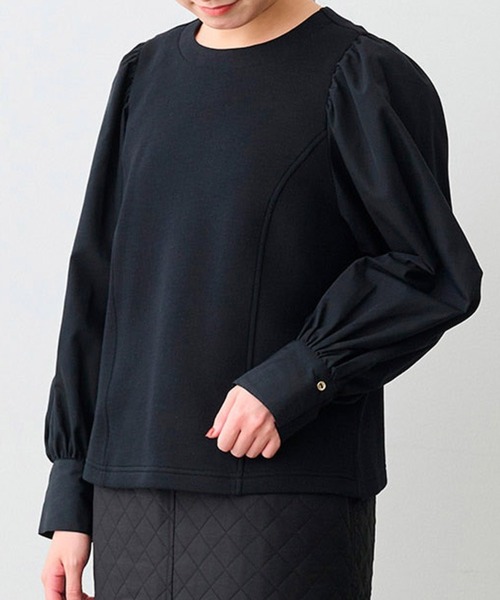 気品がふわり大人のパフスリーブ ブラウスのきちんと感と、カットソーの着心地のよさを一枚に。 袖は布はく素材でギャザーたっぷりの立体感を持たせたトレンドのボリュームスリーブ。 身ごろはほどよい厚みと丈感のカットソー素材のプルオーバーだから、忙しい朝もこれ一枚で軽やかに上品度アップ。 ■FROM IEDITプランナー ―生地の厚さ:袖は張りのある布はく素材です。 身ごろはやや厚手のカットソー素材です。 ―透け感:ありません。 ―伸縮性:身ごろのみカットソーによる伸縮性があります。 ―コメント:ラインを拾わない、ほどよくスッキリしたサイズ感です。 袖部分と本体の異素材遣いが可愛いポイント。 デニムやフレアースカートとも好相性です。