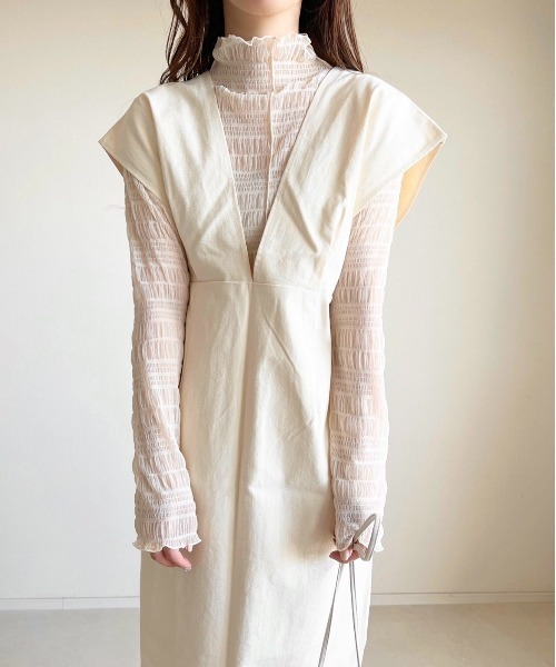 くしゅっとした素材が可愛いハイネックシアートップス。首元と袖口はメロン仕上げでフェミニンな雰囲気に。1枚で着ても、インナーとしても活躍してくれる優秀トップス。