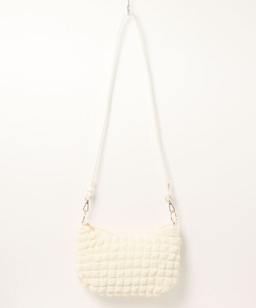 【WEARISTA haruさん紹介】・ぷくぷくとした凹凸感のある素材がかわいいショルダーバッグ。・人気のポップコーン素材を使用。・表地は伸びる素材で収納力アップ。・裏地が付いているので強度も安心です。【素材】ポリエステル【サイズ】 横幅:26cm 高さ:18cm マチ:8cm ショルダー:約60~115 cm【仕様】[開閉]ファスナー[メイン収納内側]PCポケット×1、オープンポケット×3、ファスナーポケット×1、ボトルホルダー×1[サブ収納内側]オープンポケット×2[外側]オープンポケット×2、ファスナーポケット×2、キャリーオンベルト[外側フロントポケット内側]キーフック【重さ】約435g【原産国】中国【ご注意】・お客様のモニター環境や、お部屋の照明・日当たり具合などにより、実際のお色味と異なる場合がございます。・サイズ・重さは、平置き・メジャー採寸のため、商品ごとに多少の誤差が生じる場合がございます。・プリント・型押し加工などの柄物は、裁断位置により一点一点表情の違う仕上がりになります。・生産時期により、色・サイズ・デザインが多少異なる場合がございます。・製造工程の関係上サイズ感には若干の個体差がございます。アパレル、ストールなどの布製品【約-2cm~+2cm】ニット製品【約-3cm~+3cm】