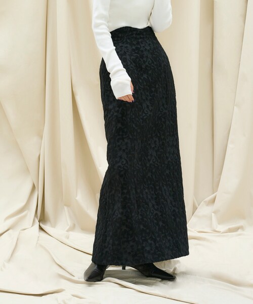 立体感のあるジャカード生地を使用したタイトスカート。 タックインのスタイルをよりお楽しみいただけるよう、ウエストラインは波型に。 国内ジャカード織物の一大産地である、群馬県桐生市で織られた生地を使用。 黒1色で奥行きのある柄を表現するため、6種類の素材を織り上げています。