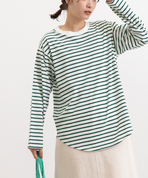 ベーシックシルエットの着回しし易い形のロンTee ■Point ・ボーダーとドットプリントの定番の柄展開で揃えました。 ・ラウンドテールは、レイヤードからちらっと見えた時のポイントに。 ・秋の定番アイテムとしてマストなボーダー、ドットはコーディネートのアクセントにおすすめです。 ・今年らしいグリーンボーダーがいち押し、黒地にはアイボリーのドットで秋カラーになじむ落ち着いたカラーです。 ・スリットの配色やピスネームもさりげなくアクセントを効かせています。 ■Styling ・トレーナーやニット、ベストやジャンスカなどとレイヤードにマルチに活躍してくれる1枚です。 -------------------- 透け感:なし 厚さ:普通 伸縮性:ややあり -------------------- POU DOU DOU プードゥドゥ ひと手間加えた存在感のある「日常着」 いつまでもときめきとかわいいを忘れない方への 愛着を持てるワードローブ = お気に入り登録がおすすめ!= POU DOU DOUのお得な情報をいち早くお届け致します◎ アイテムをお気に入り ⇒ SALE START / 完売COLOR再入荷 / LAST1点 etc... ブランドをお気に入り ⇒新商品 / 再入荷 /クーポン・セール情報 etc...