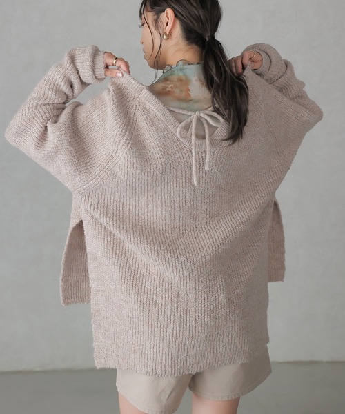 女性らしさを引き立てるバックシャンニット◎ ■デザイン Vネックと背中開いたデザインがポイントのオーバーニット。 前後で丈に差をつけてアクセントに。 サイドにスリットを入れてあるので、抜け感が出て今っぽい雰囲気。 袖口はリブを使いボリューム袖を引き立てるシルエットに仕上げています。 温かみのあるメランジニットで発色も美しく、秋冬を彩る色展開も魅力的です。 ■素材 柔らかく優しい素材。 ちくちくせず快適な着心地です。 ■スタイリング 裾にスリットが入っているので、フレアスカートと合わせた時もスカートのシルエットを崩しません。 ワンピースやサロペットの上に重ねて頂くのもオススメ。パンツにもスカートにも合わせやすい丈感です。 インナーに背中の開いたものを合わせると、肌見せで女性らしく着こなして頂けます。 ハイネックのトップスを合わせて覗かせて着るのもトレンドライク。 ------------------------------ 【スタッフが着用しました!】 身長:153cm 普段着用サイズ:S~Mサイズ 今回着用サイズ:FREEサイズ ・着用感 ゆるふわっと着用できました◎ Vネックが深めに設計されているので、 片方の肩をオフショルにしたり、中にレイヤードして着用するなど 着回しの利く一着ですね♪ ------------------------------------------------ 身長:164cm 普段着用サイズ:M~Lサイズ 今回着用サイズ:FREEサイズ ・着用感 画像通りの着用感でした! 深めのスリットや、バッグリボン、ふんわり袖がトレンドライク♪ 3色のくすみカラーが揃っていてどの色もカワイイ◎ 春はデニムの上に白Tと合わせ、一枚で出かけたいですね♪ ------------------------------------------------ ※他のキャンペーンにより、期間中に価格が変動する場合があります。 ※セールは予告なく終了させていただく場合もあります。
