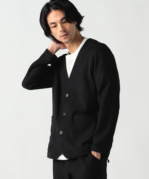 カーディガンの着やすさにジャケットを象徴するディテールを合わせた、オンオフどちらも対応可能な新感覚なカジュアルジャケット(セットアップ対応アイテム)・デザインカーディガンのようにリラックスした着心地を残しつつ、ジャケットを象徴するフォルム、パッチポケットや3つ釦などのディティールを取り入れた新しいジャケットです。ストレッチ性があり、シワになりにくいの在宅勤務やテレワークなどにも対応する事が出来ます。同素材でパンツも展開してるのでセットアップで着用する事もできます。・シルエットボタンを開けて着るとカーディガンのように軽い羽織りのようなシルエット、釦を閉めて着用するとジャケットのようにきっちりとしたシルエットになっています。見た目以上に生地にストレッチが効いているので釦を閉めてもストレスはありません。・ファブリック素材はスーツの生地のような微光沢生地にポリエステルストレッチを使用する事で見た目とは違ったストレッチ性が効いた着心地です。程良く厚みがあるので防寒の羽織りとしても使えそう。シワになりにくく、ケアも簡単です。洗濯機で洗えるイージーケアもポイントです。・スタイリング同素材で展開しているパンツとセットアップで在宅勤務、テレワークでの部屋着兼用としてもおすすめです。生地の表面感がきれいなのでインナーはTシャツなどカジュアルでもまとまります。パンツはテーパードなどすっきりとしたシルエットのものとの相性が良さそうです。※ご家庭でのお洗濯可能な商品です。詳細、取り扱い方法は商品に付いている品質表示、アテンションタグをを御確認下さい。*****************裏地:無し伸縮性:あり光沢感:ややあり生地の厚さ:普通透け:なし*****************<スタッフ着用コメント>本社 Hさん身長:178cm/体重:66kg/体型:普通/普段サイズ:48(L)/着用サイズ:48(L)サイズ感:大き過ぎない程よいサイズ感。素材感:スーツ地のような程よい微光沢感がある。着心地:軽くてストレッチ性もあり着やすい、シワになりにくい