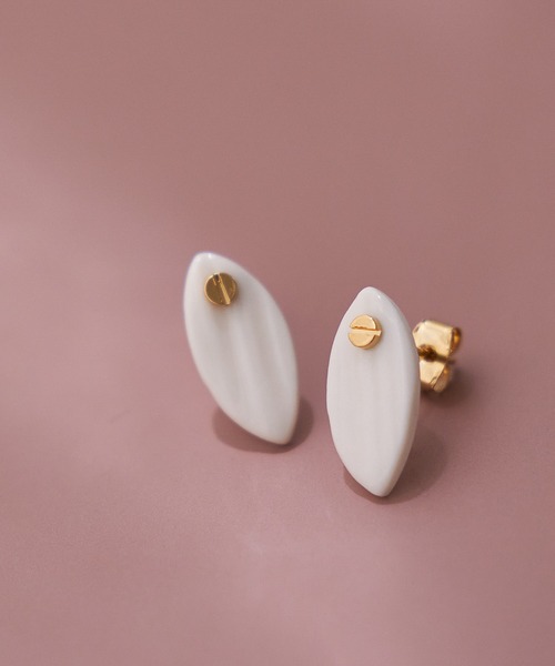 顔周りのさり気ないワンポイントに◎ 葉をモチーフしたデザインのピアスです。 ヴィッシーとはフランス語でネジという意味でその名の通り、葉っぱがネジで留められたようなデザイン。 ナチュラルな雰囲気でありつつも、耳元に存在感を与えてくれます。 シンプルなデザインなので様々なスタイルに合わせやすく、コーディネートを引き立ててくれます。 ※葉の葉脈に釉薬がたまり、白っぽくなっているものもありますがハンドメイドのため、若干個体差があります。 ※ATTENTION※ ・金属部分のメッキは水に弱いため、品質を長持ちさせるために、温水、冷水にかかわらず、水とのコンタクトは極力避けてください。 ・手を洗われる時、香水、クリームなどの化粧品をつけられる時、就寝時、入浴時などは外してください。 ・ご使用にならない時は、小袋や箱などに入れて、空気や光に当たらないように保管してください。 ・全てハンドメイドのため大きさは僅差があります。 ・モチーフが汚れた時は、石鹸か食器洗い用洗剤を少量付けまして、柔らかい布などでやさしく吹いてください。 ・モチーフはセラミックで破損の際修復ができないため、お取り扱いには十分にご注意ください。 【Vesna Garic/ヴェスナガリック】 デザイナーのヴェスナは、ファイナンシャル・アナリストとしてキャリアを積んだ後、パリのL’ecole Arts et Techniques Ceramiques (セラミックのアートとテクニックの学校)に通いながらセラミックでジュエリーの製作を開始。セラミックそのままの美しさを表現するためにあえて精製をせず、その代わりに、肌に触れた時の感触が滑らかに感じられるまで、一つ一つ丁寧に磨き上げてられています。建築的なラインやカーブ、異なる素材によるコントラスト、エナメルが醸し出す光沢感などを、小さなジュエリーの中に表現するよう心掛けています。