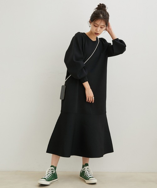 女性らしいシルエットのマーメイドワンピース【デザイン・シルエット】 パフスリーブの袖と裾に向かってマーメイドシルエットのロングワンピースは1枚で様になります。 <POINT> ・袖のパフスリーブはタックを取りボリュームを付けて立体感を出し、肩が大きく見えないように肩幅を内側に入れるなど調節して仕上げました。 ・裾切替えのマーメイドは構築的になるようにフレア分量を調節。 ・ミニ丈バージョン(BVE32200)も展開しています。 【素材】 目面がきれい見えする総針編みで仕上げています。 洗濯機洗いが可能なので日々のお手入れも簡単です。 一部再生ポリエステルを使用しています。 【カラー】 ブラック・ベージュの2色展開。 【おすすめのスタイリング】 シンプルなデザインなのでファー小物など季節感のあるアイテムをプラスするのも◎ 足元はブーツ合わせがおすすめです。 ----------------------------- 裏地:なし 光沢感:なし 透け感:なし 伸縮性:あり ポケット:なし ボタン:なし 生地の厚さ:普通 季節:秋~春 ----------------------------- 【モデル着用サイズ】 全色モデル身長:166cm、着用サイズ:F 八木アリサさん身長:167 cm、着用サイズ:F ※画像の商品はサンプルです。 実際の商品と仕様、加工、サイズが若干異なる場合がございます。