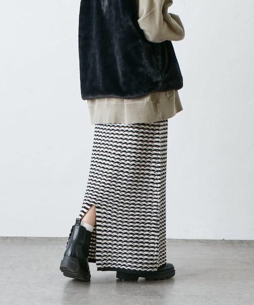 ピュアルセシン 2022 AW collection【UNBLEACHED MILITARY】日々新たなニューノーマルが定着していく中でエッセンスとして今季はアーミーテイストを取り入れ変わらない美しさと上品な素材感を大切にし、洗練されたスタイリングの提案。◇デイリーに着回しが効く、ジャガード編みスカート◇●デザインジャガード編みが目を引く、ラフなニットスカート。ウエストは総ゴム仕様で、イージーな穿き心地です。脚のラインを拾わないストレートシルエットで、後ろにはスリットが入っており足捌きが楽ちん。厚みの無い生地ですが裏地が付いているので、透ける心配はございません。●カラー展開スタンダードなアイボリーに異なった2つの柄を加えた3色展開●素材重みを感じない軽やかな生地です。裏地付きなので安心。●スタイリングルーズなスウェットを合わせたラフなコーディネートや、トレンドのベスト合わせなど様々なスタイリングに合わせやすいシルエット。裾丈が丁度良いので、スニーカーやショートブーツ、サイドゴアブーツなど足元のお洒落もお楽しみいただけます。===============================透け感:なし裏地:あり伸縮性:あり光沢感:なし生地の厚さ:普通【スタッフコメント】年齢:20代前半/身長:157cm/普段着用サイズ:Mサイズサイズ感:脚のラインを拾わないゆとりがあります。素材感:厚みの無い軽やかな生地感。===============================※撮影場所やお使いのモニター環境により若干お色味が異なる場合がございます。特にロケの撮影では明るく見える傾向にございます。※予約商品はサンプルで撮影をしております。若干の仕様が変更になる場合がございますので予めご了承の上ご注文くださいますようお願いいたします 。