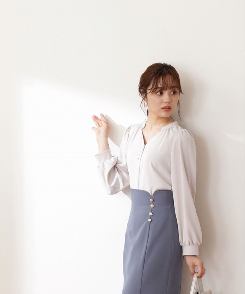 【商品特徴】フロントのパールデザインが大人フェミニンな印象のブラウスです。衿ぐりの開き具合のカットラインもこだわり、フロントパーツが女性らしさを引き立てます。ボリュームスリーブに対して、肩幅をコンパクトにしてスッキリ着れるよう仕上げました。落ち感があり光沢をおさえたサテン素材を使用、上品な印象に見せてくれます。【スタイリング】タイトやフレアスカート、マーメイドシルエットのスカートにINするとスタイルアップ見えする着こなしが完成します。
