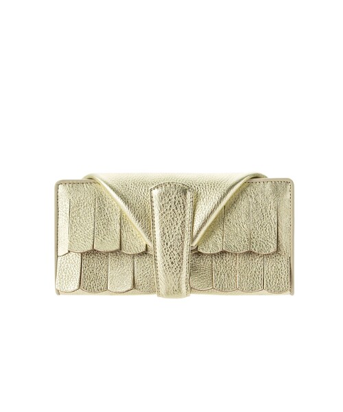 ●価格改定のお知らせ 近年の原材料価格の高騰により、こちらの商品は6月上旬から、価格改定を実施させていただきます。 それに伴い、現在の価格での販売は5月下旬をもって終了致します。 誠に申し訳ございませんが、何卒ご理解のほどお願い申し上げます。 動きによってフリンジが綺麗に乱反射し、持っていて楽しくなるシリーズ 【デザイン】 FRANGIA(フランジャ)…フリンジ、房 「ベルト」をテーマにしたデザイン。 使っていくうちにそれぞれのフリンジがカールし、立体的なニュアンスが楽しめます。 小さな手にもフィットする、小ぶりな作りが嬉しい<長財布ミニ> スナップボタンを外すとお財布全体が箱型の作りになっており、大きな小銭入れのように開きます。 スナップボタンは2つ付いているので、容量に合わせて調節が可能です。 小銭は開いたときに底になる大きな面で見れるので、いくら入っているかわかりやすく、取り出しやすくなっています。 そのため、小銭が出しにくく溜まってしまうということがなく、軽く、すっきりとした状態を維持でき、型崩れも防ぐことができます。 小銭の出し入れと同じ向きのまま、カード、お札が取り出せるので、無駄のないスムーズな動きで出し入れが可能です。 カード入れ:6箇所 / お札入れ:3箇所 / 小銭入れ:1箇所 / スナップボタン調節:2段階 【素材】 タンニンなめしのキップ(牛革)をシュリンク加工しています。 シルバー(016)は箔を貼り、ホワイト(002)は顔料で仕上げました。 ※シルバーは日常の使用により起こる摩擦で徐々に箔が擦れてまいります。 箔が擦れることにより生まれる表情の変化をお楽しみください。 ※ホワイト(002)は、色ムラのある素材を使用しているため、一点一点色の出方が異なりますのでご了承ください。 店舗へのお問い合わせ商品番号:709-31784 ●製品寸法: 00(FREE):H9.2cm W18.5cm D2cm 付属箱H11cm 付属箱W20.5cm 付属箱D4.7cm 備考:重量:約165g(サンプル重量)