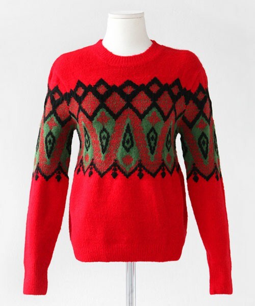 ふかふかの肌触りのニット。厚手の生地のウール混紡アイテム。ブラックトーンで柄が描かれたベージュ、グリーンとブラックカラーで描かれたレッドの2色展開。目を引くダイヤ柄はコーディネートのポイントになります。