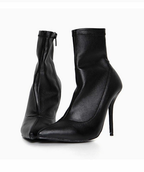 靴下をレイヤードしているかのようなユニークブーツ。シャープなつま先がエッジの効いたデザイン。足首にタイトフィットするモードな一足。