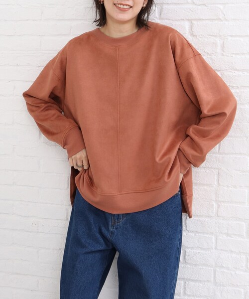 ------------------------------------------------フェイクスエードの素材でコーデに差がつく!------------------------------------------------■デザイン衿・袖口、裾の幅広めのリブ、切り替えなどシンプルながらもアクセントを入れたデザイン。滑らかな質感のフェイクスエードを使用したプルオーバー■スタイリングゆったりしたシルエットで、スキニーなどシンプルボトムとのデイリーカジュアルにぴったり!やや深めのサイドスリット入りのデザインなので、ゆるめのスカートやパンツと合わせても抜け感のあるコーデが作れます。■親子リンク対応こちらの商品は親子でリンクコーデが可能です。大人用:C62-15033 子供用:122-15360■生地詳細柔らかく滑らかな質感と、見た目も上品なフェイクスエードを使用しています。透け感:なし伸縮性:ややあり生地の厚み:普通裏地:なしモデル情報:身長167cm B78 W62 H88 着用サイズ:02(M)店舗へのお問い合わせ商品番号:C62-15033●製品寸法:00(FREE):着丈64cm B120cm 袖丈51cm 肩幅57cm備考: