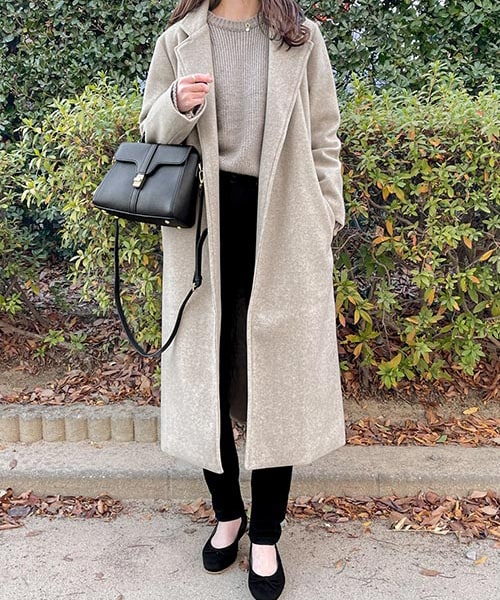 シンプルなデザインのロングコート。生地はなめらかな肌触りです。ベルトループ付きでウエストストラップがセットになっているのでウエストマークして着れます。裏地あり。サイドポケット付き。着用画像:ベージュ
