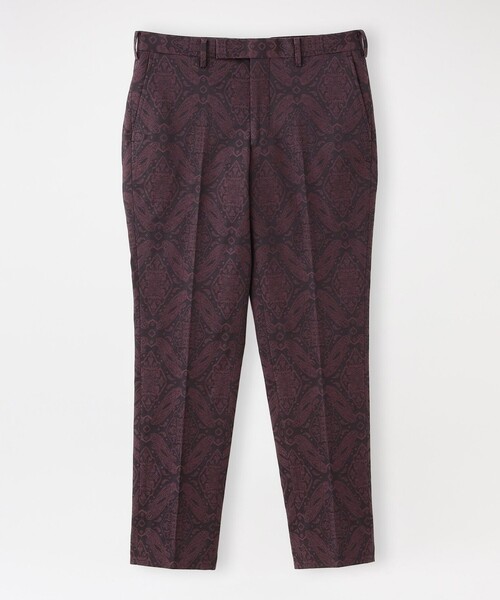 一からオリジナルで制作したインパクトのあるオーナメント柄が目を引くスリムトラウザーズ【素材】表地には、縦糸にポリエステル糸、横糸に綿糸×ポリウレタン糸で織ったジャガード素材を使用しています。ポリウレタン混なので、ストレッチ性があり、履き心地も快適です。【シルエット/デザイン】裾に向かって細くなるテーパードシルエットです。テーパードシルエットは脚のラインを綺麗に見せ足元をスッキリさせることで、スタイルが良く見える効果があります。ベルトフロントには持ち出しをつけており、ベルトをしなくてもフィット感を持たせることができ、腰回りを綺麗に見せてくれます。【スタイリング/その他】同柄同素材のオーナメントジャガードジャケット(65D10-800)と合わせたセットアップスタイルがオススメです。それぞれ単体での着用も可能なのでコーディネートの幅が広がります。総柄なので、無地のトップスと合わせても、コーディネートが完成される一品です。