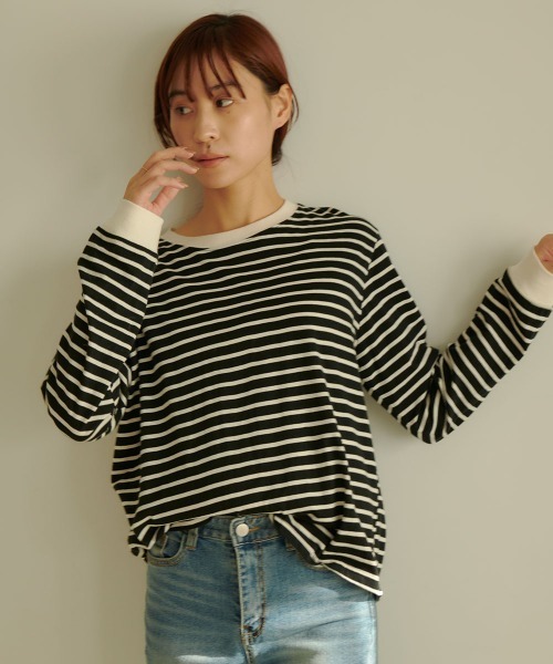 コンパクトに見せて程よいゆとりのある大人のシルエットのボーダーTEE。 長袖で着心地が軽く体を締め付ける様なタイトなシルエットでもない、ストレスのない、エッセンシャルな1枚。細めのピッチのボーダーで主張が強すぎずあらゆるボトムや上着ともスタイリングしやすくコーデにも困りません。 襟元と袖口をナチュラルなアイボリーカラーのリブに切り替えほんのりマニッシュ感を。でもオーバーサイズすぎずメンズライクな印象にならず女性らしく着こなせる絶妙なニュアンスに仕上げた1枚になっています。 ぽってりするような素材ではなく薄手なので重ねられるという利点があり、逆にロングシーズン着られるというメリットも。 1枚で着ても、コートやカーディガン、ジャケットの中にインナーとして着ると他にシンプルな無地ものを合わせてもプレーンになりすぎず主張しすぎないポイントとしてちらっと見せておくのもお洒落です。パンツだけでなくスカートに合わせてもOK! 綿100%なので肌触りもとてもいいですよ! [着用時期]真夏以外のオールシーズン(約18℃以下) [透け感]ほぼなし [生地の厚み]薄手 [ストレッチ]あり [生地のやわらかさ]やわらかい [生地の特徴]さらっとした薄手のTシャツ素材 [落ち感]なし [着用ジワ]袖や座った時のナチュラルなシワ [身長]全ての方に(身長によって着丈が変わります) ※感じ方には個人差がございますので気になる部分がありましたらお気軽にお問い合わせください