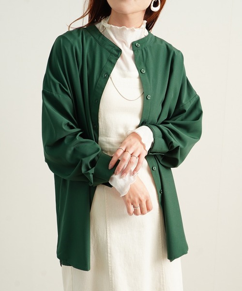 ◆軽やかバックプリーツブラウス◆《ディテール》後ろ姿に個性をプラスしたデザインブラウス。動くたびに揺れるバックプリーツが程よい甘さを演出してくれます。締め付けの少ないデザインなので着心地良く体型カバーも◎フロントはシンプルなバンドカラーブラウスなので合わせやすいのも魅力。《ファブリック》さらりとしたスパン混のブロード生地は上品見えしてくれるので、お出掛け着だけでなくオフィスコーデにも使えます。《スタイリング》デザイン性のあるブラウスは、お手持ちのボトムに合わせるだけでオシャレ見えします。テーパードパンツやタイトスカートで女性らしく着こなすのはもちろん、カジュアルにデニムを合わせても可愛いです。