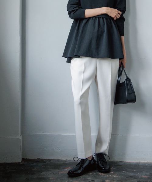 【STORY11月号掲載】 らくちん&美脚!な、イージーテーパードパンツ 【素材】 ・ストレッチの効いたダブルクロス(2重織り)素材を使用。 ・やや肉厚な素材に仕上げているので、カラダのラインを拾いにくく、キレイなシルエットを作ります。 ・しっかりストレッチが効いているのではき心地も〇 ・シワにもなりにくく、ご家庭でのお洗濯が可能なのもうれしいポイントです。 ※裏地なし ※マシンウォッシャブル、イージーケア。 ※同素材のワイドパンツ(637-65029)もご用意がございます。 【デザイン】 ・ボリュームが出すぎないので、トップスを選ばずスッキリこなせるテーパードシルエット。 ・レッグラインを美しく魅せる、パターンにこだわったテーパードライン。 ・ウエストはゴム仕様でイージーなはき心地です。 ・ゴム周りのギャザー分量を計算し、着用した際にもたつかずスッキリとしたバランスに。 ・ドローコード入りでウエスト位置の調整も可能です。 ・ストレッチの効いた素材で、ほどよい肉感もあるので、細めのシルエットでも張り付かず、細見えが叶います。 ・センタープレス入りでさらに脚長&キレイ見え効果をプラス。 ※ポケット数:横×2、後ろ(ダミー)×2 ※34サイズ、42サイズはWEB限定展開サイズです。 こちらの商品は主に冬に着用いただける商品です。 モデル情報:身長165cm B72 W57 H84 着用サイズ:38(M) 店舗へのお問い合わせ商品番号:637-65028 ●製品寸法: 34(SS):着丈93cm W62cm H93cm 股下62cm 36(S):着丈94cm W65cm H96cm 股下62cm 38(M):着丈95cm W68cm H99cm 股下63cm 40(L):着丈98cm W71cm H102cm 股下65cm 42(LL):着丈98cm W74cm H105cm 股下65cm 備考: