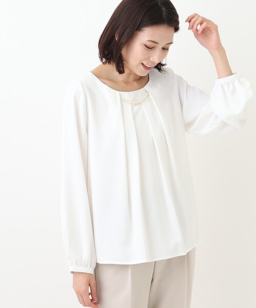 【デザイン】胸元のデザインがポイントになった滑らかな質感のブラウス。胸元のタックがポイントのブラウスに、取り外し可能のパール調アクセパーツをつけました。セレモニー、通勤着やお出かけ着のインナーとして、また、アクセあり・なしの2WAYでつかえる汎用性あるアイテムです。【素材】さらりとした肌触り、とろみ感があるポリエステル素材を使用しています。※こちらの商品はやや透け感があるため、インナーの着用をおすすめします。#通勤#セレモニー#ママスーツ#入卒#卒園式#卒業式#入学式#入園式#学校訪問服#パーティドレス#フォーマルレディス#結婚式#七五三#ママ#母スーツ※照明の関係により、実際よりも色味が違って見える場合があります。また、パソコン・スマートフォンなどの環境により、若干製品と画像のカラーが異なる場合もございます。モデル情報:身長167cm B78 W62 H88 着用サイズ:02(M)店舗へのお問い合わせ商品番号:C62-81300●製品寸法:01(S):着丈55cm B94cm 袖丈49cm 肩幅37cm02(M):着丈56cm B97cm 袖丈50cm 肩幅38cm03(L):着丈57cm B100cm 袖丈51cm 肩幅39cm04(LL):着丈58cm B103cm 袖丈52cm 肩幅40cm05(3L):着丈59cm B106cm 袖丈52cm 肩幅41cm備考: