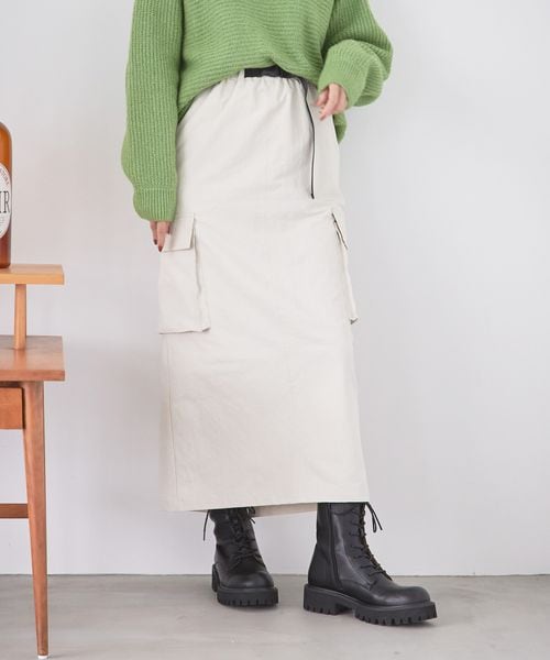 ーーー ◇デザイン ウエストのガチャベルトがポイントのミリタリースカートです。 サイドに大きめのポケットを施しており、 カジュアルな印象で着ていただけます。 ーーー ◇スタイリング ウエストにポイントがあるので、薄手のニットをインするスタイリングや 短丈トップスとのスタイリングがオススメです。 フレアシルエットですが、すっきりとしているので アウターともバランス良く着ていただけます。