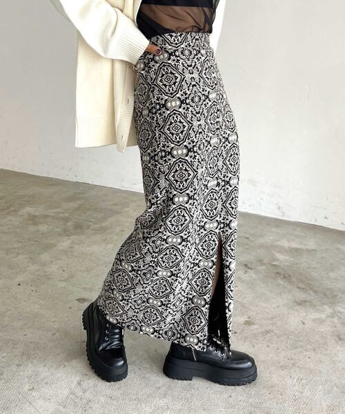ーーー ぱっと目を引くダマスク柄を表面感のあるジャガード生地で織り上げた印象的なナロースカート 柔らかく、程よい伸縮性のあるカットソー生地を使用しているのでリラックス感のある履き心地です。 ーーー ショート丈トップスやジレを合わせてモードなスタイリングがおすすめのアイテムです。 〈注意事項〉 ・サンプルにて撮影をしておりますので、実際の商品とは素材や仕様・加工・サイズ等が若干異なる場合がございます。 ・モニター・環境等により実際の商品と色味が多少異なって表示される場合がございます。予めご了承をお願いいたします。 ・撮影環境により、光の当たり具合で色味が違って見える場合があります。あらかじめご了承下さい。 ・柄の出方に個体差が生じるアイテムとなっている為、商品画像と多少見え方が異なる場合がございます。