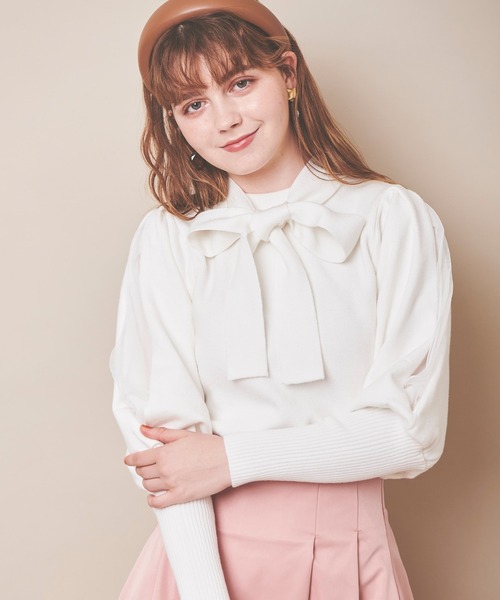 ◆◆2022Autumn/Winter Collection◆◆ タイトな身頃にパフっとした袖と長めの袖口リブが今年らしいニットトップス。 ニット袖にはスリットが入り、内側からチュールがのぞくブラウスライクな華やかデザイン。 チュール下にはシフォンを重ねているため、透け感を気にせず着用していただけます。 えりに挟み込まれたボウタイは前後どちらでも結ぶ事が可能です。 ※サイズ表記につきましては、商品によって同サイズや同色等であっても各商品毎に誤差が生じる可能性がある為、サイズ表記はあくまでも目安としてご参照ください。 ※モデル着用アイテムはサンプル商品の為、実際よりサイズや色が異なる場合がございます。サイズはサイズ詳細等にてご確認下さい。 ※モデル着用カラーは、撮影環境の兼合いにて、実際のカラーと異なって見える場合がございます。商品カラーに関しましては、物画像をご参考に確認をして頂ければと思います。 ※取り扱いについては、商品についている品質表示でご確認ください。 ※商品画像はサンプルのため、色味や仕様変更がある場合がございますので予めご了承ください。 ※画像と柄の位置が異なる場合がございます、ご了承下さい。 ※照明の関係により、実際よりもやや明るく見える場合がございます。またパソコンなどの環境により、若干製品と画像のカラーが異なる場合もございます。予めご了承ください。