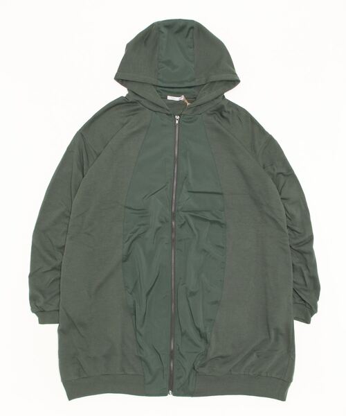 裏毛と布帛を切り替えたロング丈のパーカー。カーブの切り替えがインパクトのあるアイテムに仕上げました。袖の切り替えに入ったギャザーもポイント。しっかり長めの丈で、ゆったりした楽な着心地のサイズ感です。