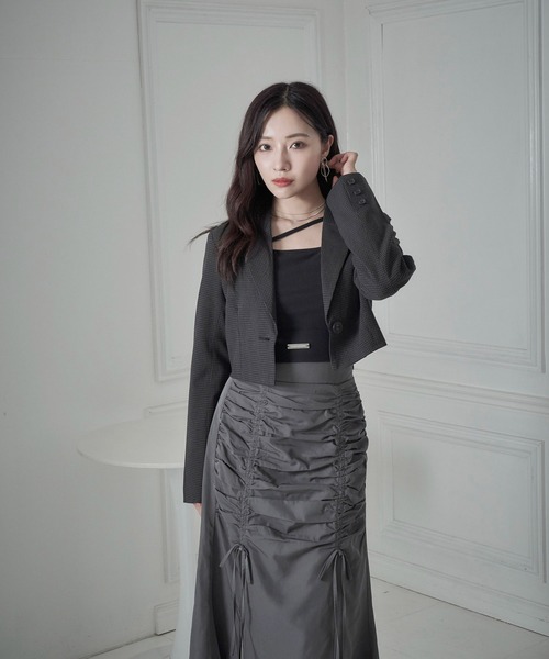 クロップド丈のコンパクトなシルエットが特徴的なテーラードジャケット。セットアップで大人らしい印象に。同素材のチェックスリットスカート(AG223SK0903)とセットアップでご着用いただけます。
