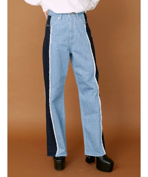 リメイク風なデザインが印象的なワイドデニムパンツです。 3色の生地を使用しており、EVRISにしかない一着に仕上がっています。 フリンジの始末もよりリメイク感を演出しています。