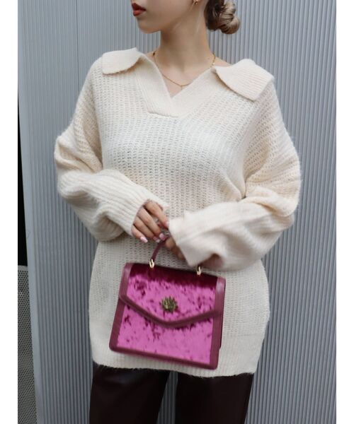 弾力のあるふんわりとした素材で制作したオープンカラーニットトップス。ヒップが隠れる着丈でフレアパンツなどとのスタイリングにちょうどよいシルエットです。