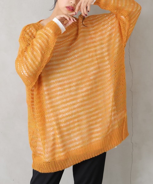 綺麗な2色の配色使いでいつものコーデに彩りを添える、ふんわりモヘヤタッチニット。 ふんわりとした起毛感のある糸をできる限りゆるく編み、素材感とは対照的に透け感をわざと出したこだわりのデザイン。 長めの着丈とドルマン袖のゆるっとしたシルエットがこなれ感を演出し、テクニック要らずでこれからの季節のレイヤードスタイルがお洒落に着映える一着です。 華やかに抜け感放つ≪n'OrLABEL≫透かしモヘヤタッチニットです。