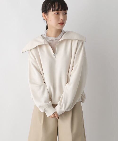 ーーー ■素材特性■ ポリエステル綿のさらっとした軽さのある風合いが特徴の裏毛を使用しています。 ■デザイン■ 大きめな衿にハーフZIPのデザイン、 裾のドロストがポイントのアイテムになります。 着丈は短めに設定しているのでドロストしてもボリュームが出すぎずバランスよく着ていただけます。 ーーー ■スタイリング例■ パンツ、スカートどちらとも相性の良いアイテムです。 スカートはタイトスカートなどすっきりとしたシルエットと合わせるのがオススメ。 気分に合わせて裾をドロストするとまた違ったシルエットを楽しむことができます。