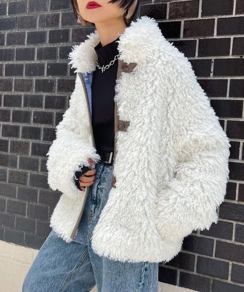 ーーー 毛足のあるカーリーボアを使用したフェイクファーブルゾン ゆるっとしたオーバーサイズのミドル丈に丸みのあるコロンとしたボリューミーなシルエット。 合皮のパイピングでトリミングしてデザインポイントに。 首元はホックでスタンドネックでの着用が可能。防寒にも◎ ーーー ミニボトムやすっきりとしたナロースカート等を合わせたメリハリのあるスタイリングがおすすめ。 コーデの主役になる存在感のある一着です。 〈注意事項〉 ・サンプルにて撮影をしておりますので、実際の商品とは素材や仕様・加工・サイズ等が若干異なる場合がございます。 ・モニター・環境等により実際の商品と色味が多少異なって表示される場合がございます。予めご了承をお願いいたします。 ・撮影環境により、光の当たり具合で色味が違って見える場合があります。あらかじめご了承下さい。