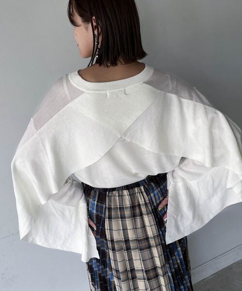 ーーー 後ろ身頃から袖にかけてのフリルが特徴的なデザインニット 思い切った太幅のフレアーが甘さ抑えめでモードな印象。 ーーー 薄手の素材で、インナー次第で長いシーズンご使用いただけるアイテムです。 〈注意事項〉 ・サンプルにて撮影をしておりますので、実際の商品とは素材や仕様・加工・サイズ等が若干異なる場合がございます。 ・モニター・環境等により実際の商品と色味が多少異なって表示される場合がございます。予めご了承をお願いいたします。 ・撮影環境により、光の当たり具合で色味が違って見える場合があります。あらかじめご了承下さい。 ・こちらのアイテムにインナーはついておりません。